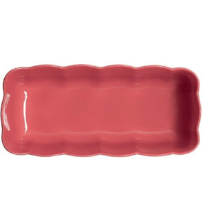 Ce moule à gâteau en céramique a une couleur rose et un bord gracieux et ondulé.